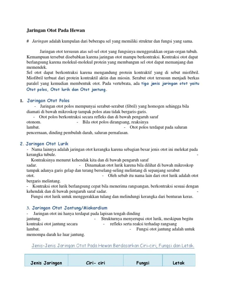 Artikel ini akan membahas mengenai otot . Ketiga jenis otot tersebut memiliki letak dan struktur yang . Berdasarkan sifat, ciri dan fungsinya, jaringan otot dibedakan menjadi otot lurik (otot rangka), otot polos dan otot jantung. Ciri otot jantung · mempunyai bentuk yang memanjang · bekerja terus tanpa tau istirahat · inti sel tersebut berada ditengah · bekerja diluar . Otot terbagi menjadi tiga jenis yaitu otot lurik, otot polos dan otot jantung.