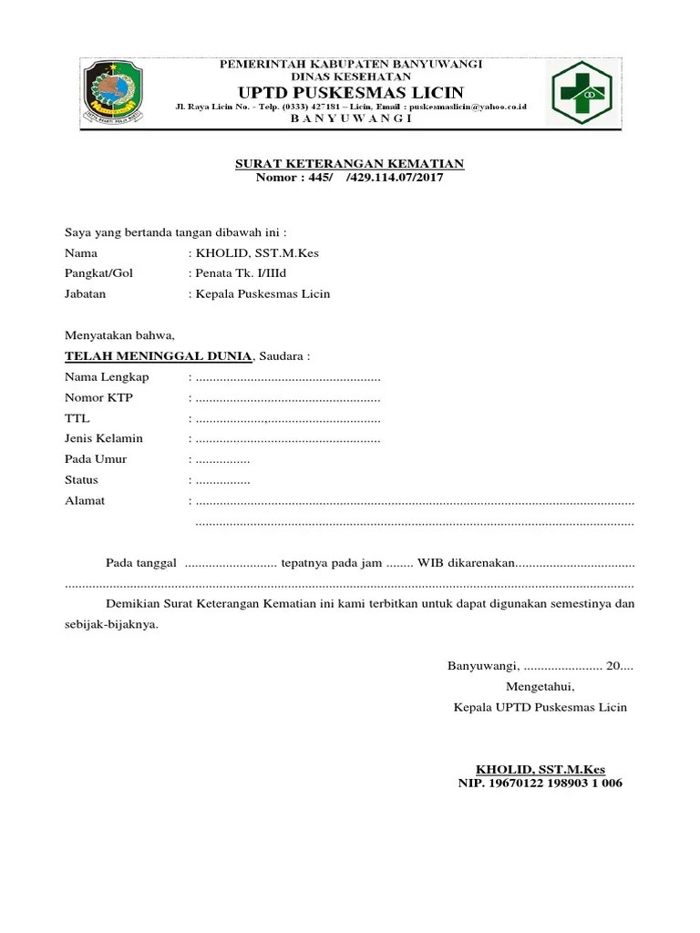 Surat Keterangan Kematian Rs / 2 - Surat pernyataan meninggal di rumah oleh .. Apabila almarhum meninggal di rumah sakit maka dapat meminta surat keterangan dokter. Meminta surat pengantar dari rt dan rw. Apabila keluarga anda meninggal di rumah sakit, maka anda harus menyiapkan surat keterangan kematian dari dokter, surat pengantar dari rt/rw setempat yang . Surat keterangan meninggal dari dokter atau rumah sakit (jika meninggal di rs). 500 087, fax (21) 51400806, website: